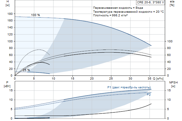 Насос оснащен асинхронным 3-фазным электродвигателем на лапах, с воздушным охлаждением. Электродвигатель включает частотный преобразователь и ПИ-регулятор в клеммной коробке. Это обеспечивает постоянное плавное регулирование частоты вращения электродвигателя, а также возможность корректировки рабочих характеристик в соответствии с заданными требованиями. Панель управления на клеммной коробке электродвигателя позволяет задавать установленное значение, а также выбирать режим работы насоса: «Мин.» или «Макс.» или «Останов». Панель управления имеет световые индикаторы «Operation» («Работа») и «Fault» («Неисправность»).