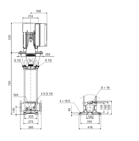 Вертикальный многоступенчатый центробежный насос с всасывающим и напорным патрубками, расположенными на одном уровне ("ин-лайн"), что обеспечивает возможность установки в горизонтальной однотрубной системе. Головная часть и основание насоса из чугуна - все остальные контактирующие с перекачиваемой жидкостью детали из нержавеющей стали. Картриджевое уплотнение вала от компании Grundfos обеспечивает высокую надёжность, безопасность сборки, лёгкое обслуживание и доступ. Вращение передается через разъемную муфту. Соединение трубопровода выполняется с помощью фланцев стандарта DIN.