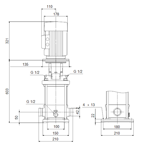 Вертикальный многоступенчатый центробежный насос с одинаковым уровнем расположения портов всасывания и нагнетания. Насосная часть и плита-основание сделаны из чугуна, остальные проточные части - из нержавеющей стали (EN 1.4301)
