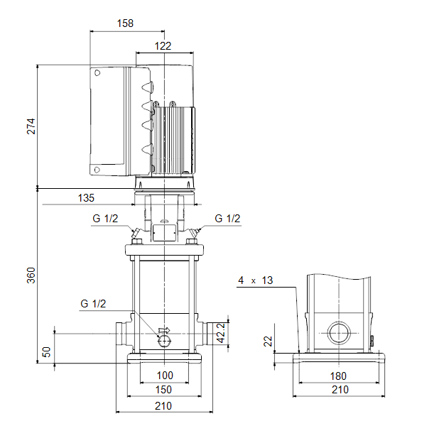 Вертикальный многоступенчатый центробежный насос с всасывающим и напорным патрубками, расположенными на одном уровне ("ин-лайн"), что обеспечивает возможность установки в горизонтальной однотрубной системе. Части насоса, контактирующие с жидкостью, выполнены из высококачественной нержавеющей стали. Картриджное уплотнение вала обеспечивает высокую надежность, безопасное использование и легкий доступ для обслуживания. Вращение передается через разъемную муфту. Соединение трубопровода выполняется с помощью муфт PJE (Victaulic®).