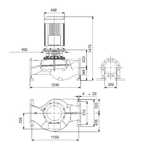 Одноступенчатый, без соединительной муфты, центробежный с всасывающим и выпускным патрубками на одной линии. Насос имеет конструкцию извлечения сверху, т.е. головную часть (электродвигатель, голову насоса и рабочее колесо) можно демонтировать для обслуживания или ремонта в то время, как корпус насоса остается на трубопроводе.