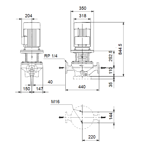 Одноступенчатый, без соединительной муфты, центробежный с всасывающим и выпускным патрубками на одной линии. Насос имеет конструкцию извлечения сверху, т.е. головную часть (электродвигатель, голову насоса и рабочее колесо) можно демонтировать для обслуживания или ремонта в то время, как корпус насоса остается на трубопроводе.