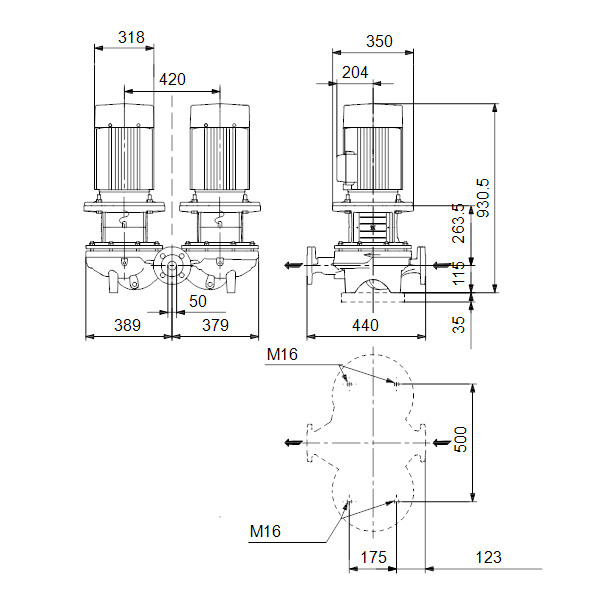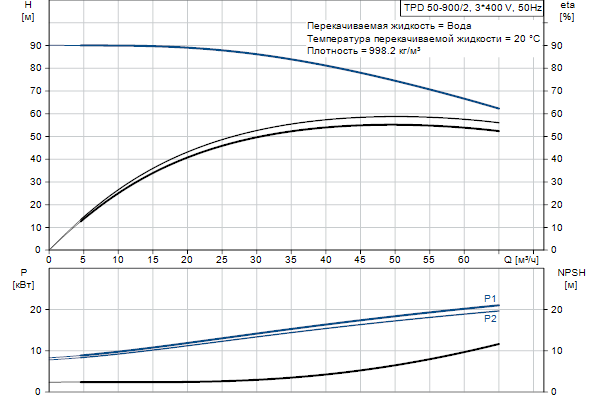 Одноступенчатый, без соединительной муфты, центробежный с всасывающим и выпускным патрубками на одной линии. Сдвоенный насос спроектирован с двумя параллельными головными частями. Насос имеет конструкцию извлечения сверху, т.е. головную часть (электродвигатель, голову насоса и рабочее колесо) можно демонтировать для обслуживания или ремонта в то время, как корпус насоса остается на трубопроводе.