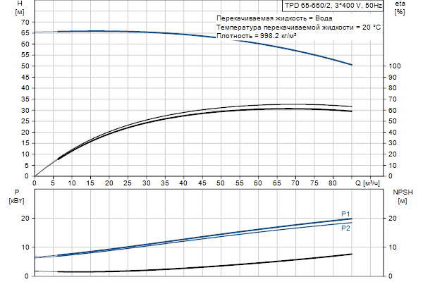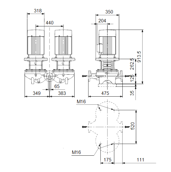 Одноступенчатый, без соединительной муфты, центробежный с всасывающим и выпускным патрубками на одной линии. Сдвоенный насос спроектирован с двумя параллельными головными частями. Насос имеет конструкцию извлечения сверху, т.е. головную часть (электродвигатель, голову насоса и рабочее колесо) можно демонтировать для обслуживания или ремонта в то время, как корпус насоса остается на трубопроводе.