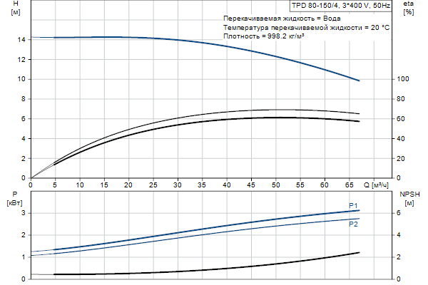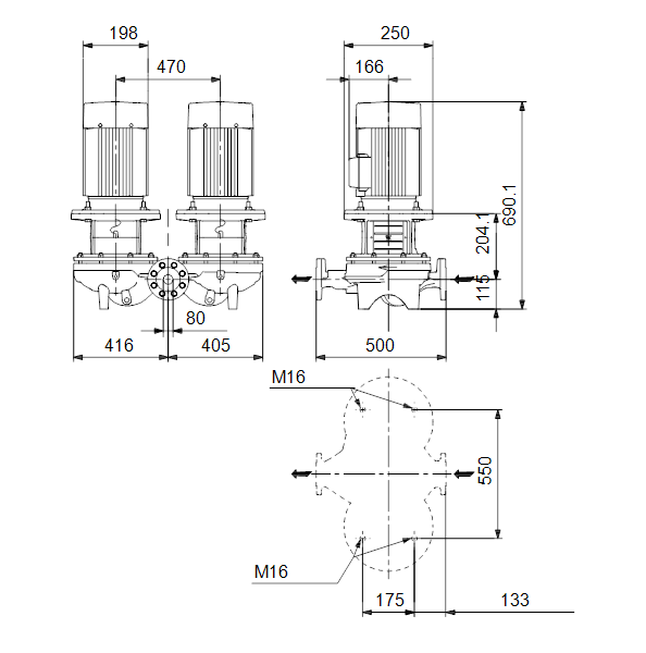 Одноступенчатый, без соединительной муфты, центробежный с всасывающим и выпускным патрубками на одной линии. Сдвоенный насос спроектирован с двумя параллельными головными частями. Насос имеет конструкцию извлечения сверху, т.е. головную часть (электродвигатель, голову насоса и рабочее колесо) можно демонтировать для обслуживания или ремонта в то время, как корпус насоса остается на трубопроводе.