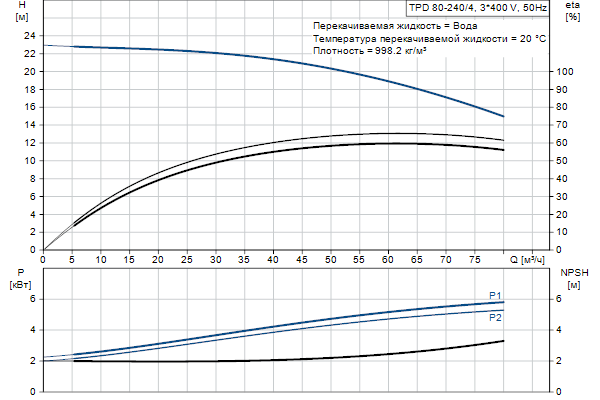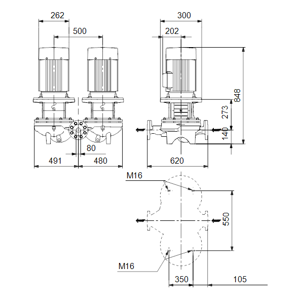 Одноступенчатый, без соединительной муфты, центробежный с всасывающим и выпускным патрубками на одной линии. Сдвоенный насос спроектирован с двумя параллельными головными частями. Насос имеет конструкцию извлечения сверху, т.е. головную часть (электродвигатель, голову насоса и рабочее колесо) можно демонтировать для обслуживания или ремонта в то время, как корпус насоса остается на трубопроводе.