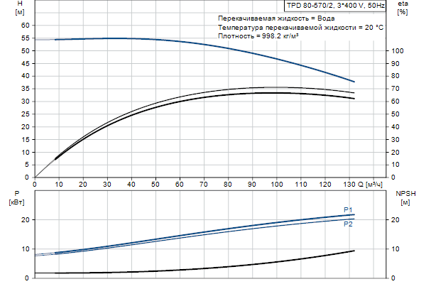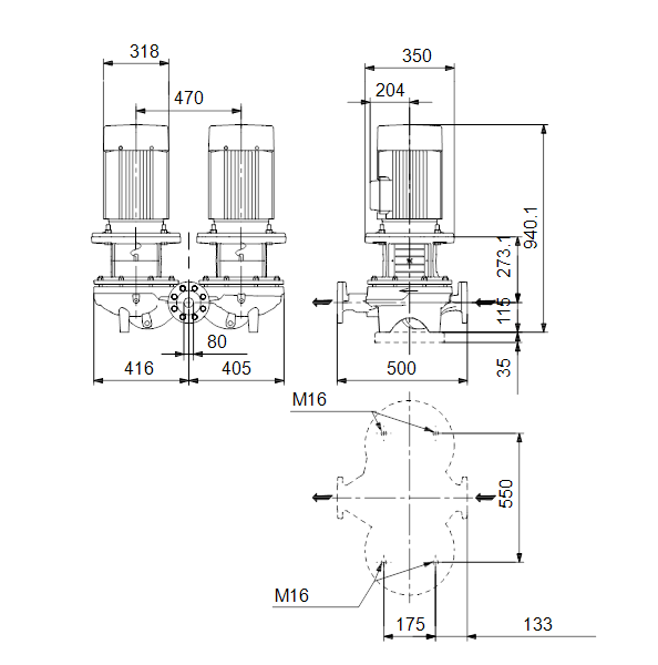 Одноступенчатый, без соединительной муфты, центробежный с всасывающим и выпускным патрубками на одной линии. Сдвоенный насос спроектирован с двумя параллельными головными частями. Насос имеет конструкцию извлечения сверху, т.е. головную часть (электродвигатель, голову насоса и рабочее колесо) можно демонтировать для обслуживания или ремонта в то время, как корпус насоса остается на трубопроводе.