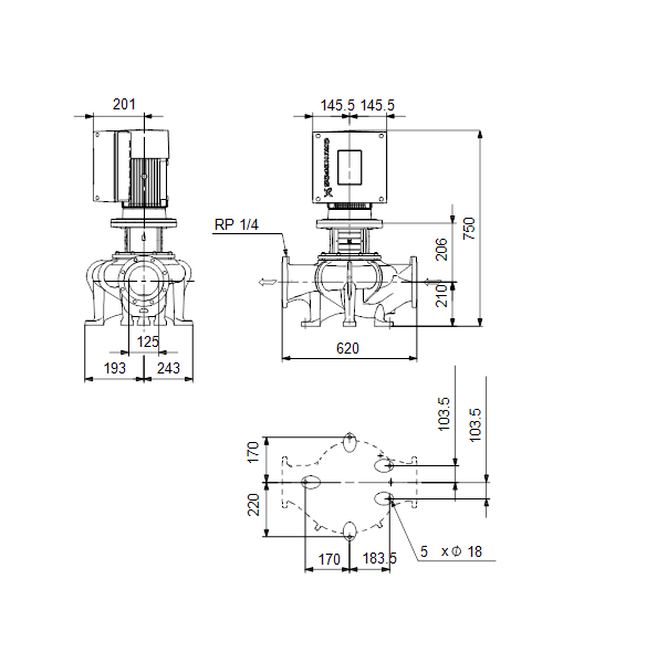 Одноступенчатый, без соединительной муфты, центробежный с всасывающим и выпускным патрубками на одной линии. Насос имеет конструкцию извлечения сверху, т.е. головную часть (электродвигатель, голову насоса и рабочее колесо) можно демонтировать для обслуживания или ремонта в то время, как корпус насоса остается на трубопроводе.