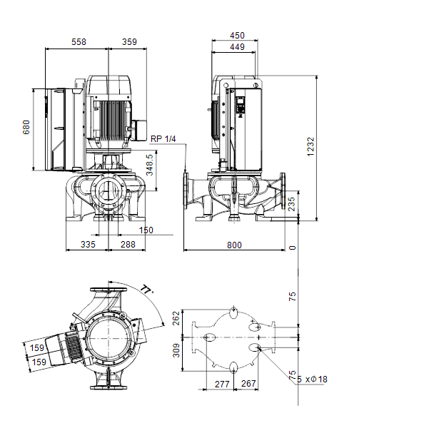 Одноступенчатый, без соединительной муфты, центробежный с всасывающим и выпускным патрубками на одной линии. Насос имеет конструкцию извлечения сверху, т.е. головную часть (электродвигатель, голову насоса и рабочее колесо) можно демонтировать для обслуживания или ремонта в то время, как корпус насоса остается на трубопроводе.