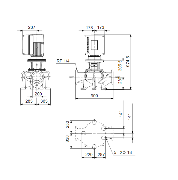 Одноступенчатый, без соединительной муфты, центробежный с всасывающим и выпускным патрубками на одной линии. Насос имеет конструкцию извлечения сверху, т.е. головную часть (электродвигатель, голову насоса и рабочее колесо) можно демонтировать для обслуживания или ремонта в то время, как корпус насоса остается на трубопроводе.