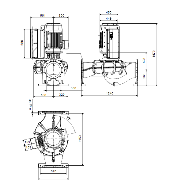 Одноступенчатый, без соединительной муфты, центробежный с всасывающим и выпускным патрубками на одной линии. Насос имеет конструкцию извлечения сверху, т.е. головную часть (электродвигатель, голову насоса и рабочее колесо) можно демонтировать для обслуживания или ремонта в то время, как корпус насоса остается на трубопроводе.