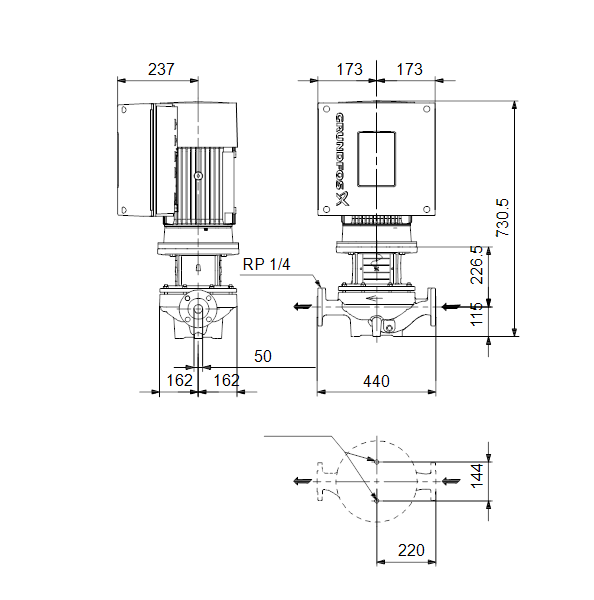 Одноступенчатый, без соединительной муфты, центробежный с всасывающим и выпускным патрубками на одной линии. Насос имеет конструкцию извлечения сверху, т.е. головную часть (электродвигатель, голову насоса и рабочее колесо) можно демонтировать для обслуживания или ремонта в то время, как корпус насоса остается на трубопроводе.