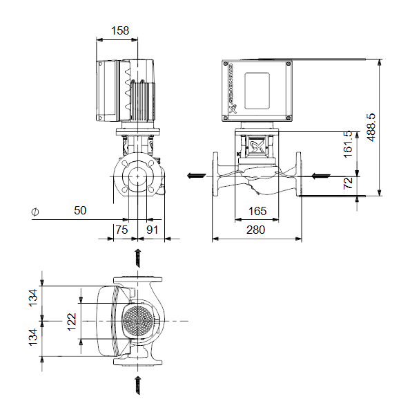 Одноступенчатый, без соединительной муфты, центробежный с всасывающим и выпускным патрубками на одной линии. Насос имеет конструкцию извлечения сверху, т.е. головную часть (электродвигатель, голову насоса и рабочее колесо) можно демонтировать для обслуживания или ремонта в то время, как корпус насоса остается на трубопроводе.