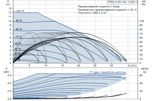 TPE3 D 50-120 S-A-F-A-BQBE-EABОдноступенчатый, без соединительной муфты, центробежный с всасывающим и выпускным патрубками на одной линии. Сдвоенный насос спроектирован с двумя параллельными головными частями. Насос имеет конструкцию извлечения сверху, т.е. головную часть (электродвигатель, голову насоса и рабочее колесо) можно демонтировать для обслуживания или ремонта в то время, как корпус насоса остается на трубопроводе. Уплотнения вала соответствуют EN 12756. Подсоединение к трубопроводу с помощью фланцев PN 6/10 DIN (EN 1092-2 и ISO 7005-2). Каждая насосная часть оснащена синхронным двигателем на постоянных магнитах с воздушным охлаждением одинакового размера. КПД электродвигателя классифицируется как IE5 в соответствии со стандартом IEC 60034-30-2. Электродвигатель включает частотный преобразователь и ПИ-регулятор в клеммной коробке. Это обеспечивает постоянное плавное регулирование частоты вращения электродвигателя, а также возможность корректировки рабочих характеристик в соответствии с заданными требованиями. Насос оснащён совмещённым датчиком температуры и перепада давления.