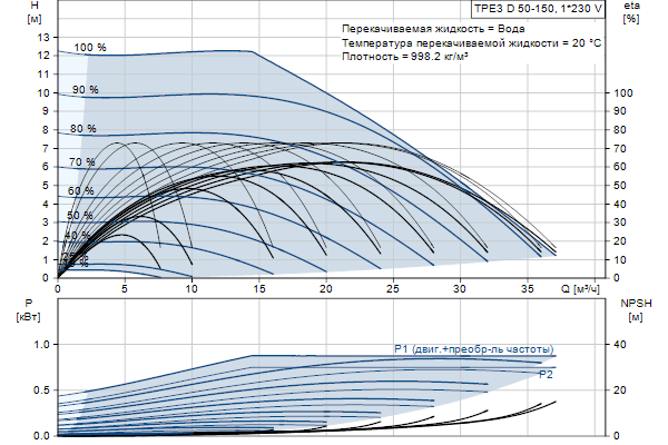 TPE3 D 50-150 S-A-F-A-BQQE-FABОдноступенчатый, без соединительной муфты, центробежный с всасывающим и выпускным патрубками на одной линии. Сдвоенный насос спроектирован с двумя параллельными головными частями. Насос имеет конструкцию извлечения сверху, т.е. головную часть (электродвигатель, голову насоса и рабочее колесо) можно демонтировать для обслуживания или ремонта в то время, как корпус насоса остается на трубопроводе. Уплотнения вала соответствуют EN 12756. Подсоединение к трубопроводу с помощью фланцев PN 6/10 DIN (EN 1092-2 и ISO 7005-2). Каждая насосная часть оснащена синхронным двигателем на постоянных магнитах с воздушным охлаждением одинакового размера. КПД электродвигателя классифицируется как IE5 в соответствии со стандартом IEC 60034-30-2. Электродвигатель включает частотный преобразователь и ПИ-регулятор в клеммной коробке. Это обеспечивает постоянное плавное регулирование частоты вращения электродвигателя, а также возможность корректировки рабочих характеристик в соответствии с заданными требованиями. Насос оснащён совмещённым датчиком температуры и перепада давления.