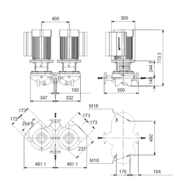 Одноступенчатый, без соединительной муфты, центробежный с всасывающим и выпускным патрубками на одной линии. Сдвоенный насос спроектирован с двумя параллельными головными частями. Насос имеет конструкцию извлечения сверху, т.е. головную часть (электродвигатель, голову насоса и рабочее колесо) можно демонтировать для обслуживания или ремонта в то время, как корпус насоса остается на трубопроводе.