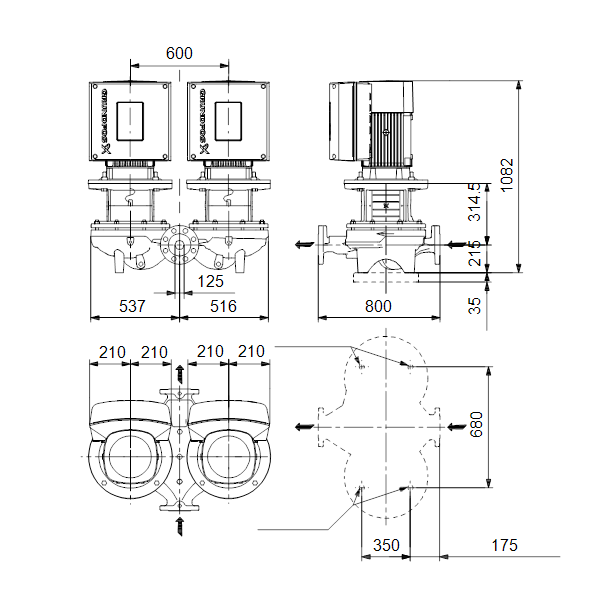 Одноступенчатый, без соединительной муфты, центробежный с всасывающим и выпускным патрубками на одной линии. Сдвоенный насос спроектирован с двумя параллельными головными частями. Насос имеет конструкцию извлечения сверху, т.е. головную часть (электродвигатель, голову насоса и рабочее колесо) можно демонтировать для обслуживания или ремонта в то время, как корпус насоса остается на трубопроводе.