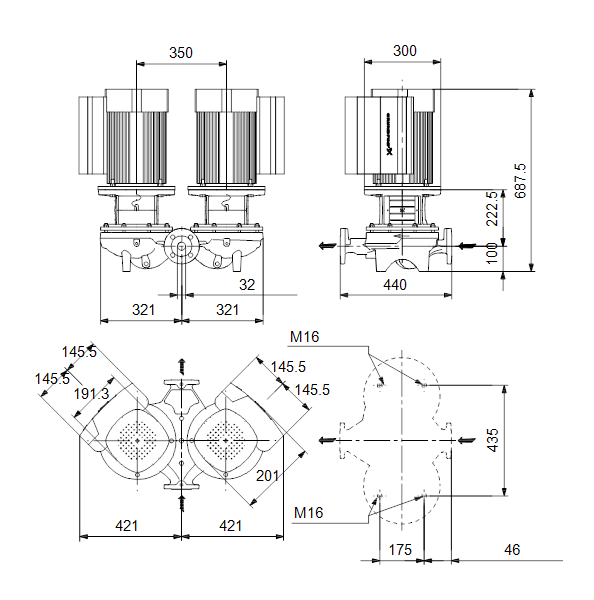 Одноступенчатый, без соединительной муфты, центробежный с всасывающим и выпускным патрубками на одной линии. Сдвоенный насос спроектирован с двумя параллельными головными частями. Насос имеет конструкцию извлечения сверху, т.е. головную часть (электродвигатель, голову насоса и рабочее колесо) можно демонтировать для обслуживания или ремонта в то время, как корпус насоса остается на трубопроводе.
