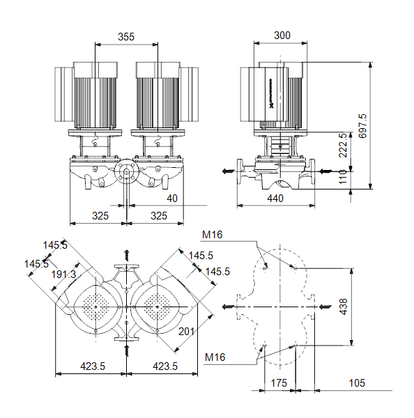 Одноступенчатый, без соединительной муфты, центробежный с всасывающим и выпускным патрубками на одной линии. Сдвоенный насос спроектирован с двумя параллельными головными частями. Насос имеет конструкцию извлечения сверху, т.е. головную часть (электродвигатель, голову насоса и рабочее колесо) можно демонтировать для обслуживания или ремонта в то время, как корпус насоса остается на трубопроводе.