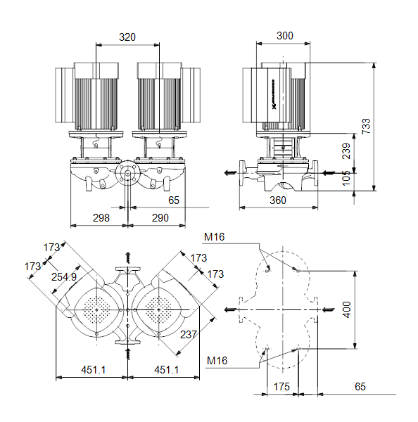 Одноступенчатый, без соединительной муфты, центробежный с всасывающим и выпускным патрубками на одной линии. Сдвоенный насос спроектирован с двумя параллельными головными частями. Насос имеет конструкцию извлечения сверху, т.е. головную часть (электродвигатель, голову насоса и рабочее колесо) можно демонтировать для обслуживания или ремонта в то время, как корпус насоса остается на трубопроводе.