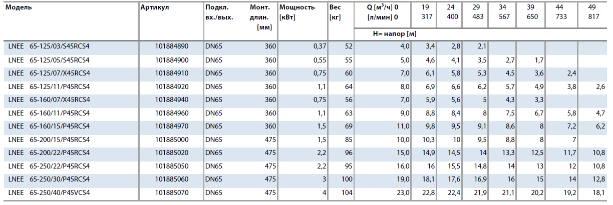 Современная конструкция и гидравлические характеристики, оптимизированные для использования совместно с преобразователем частоты, делают насосы серии e-LNEE лучшим выбором для использования в коммунальном секторе. Высокая эффективность: Новая высокоэффективная гидравлика со значением индекса эффективности MEI выше уровня европейской директивы ErP2015 и двигатели класса IE3 позволяют иметь низкие эксплуатационные затраты. Длительный срок эксплуатации и простое обслуживание: надежная конструкция и различные варианты исполнений, а также использование заменяемых колец износа позволяют продлить срок эксплуатации; насосы серии e-LNEE просто монтировать,удобная конструкция позволяет сократить время обслуживания.