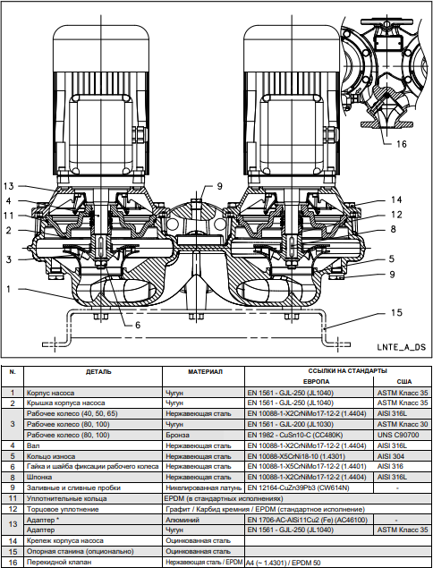 Насосы Lowara серии LNTE представляют собой сдвоенные центробежные насосы со всасывающим и напорным патрубками «ин-лайн» типа. Насосы оснащены закрытыми рабочими колесами, связанными автоматически переключающимся клапаном. Оба насоса могут работать по отдельности или параллельно.