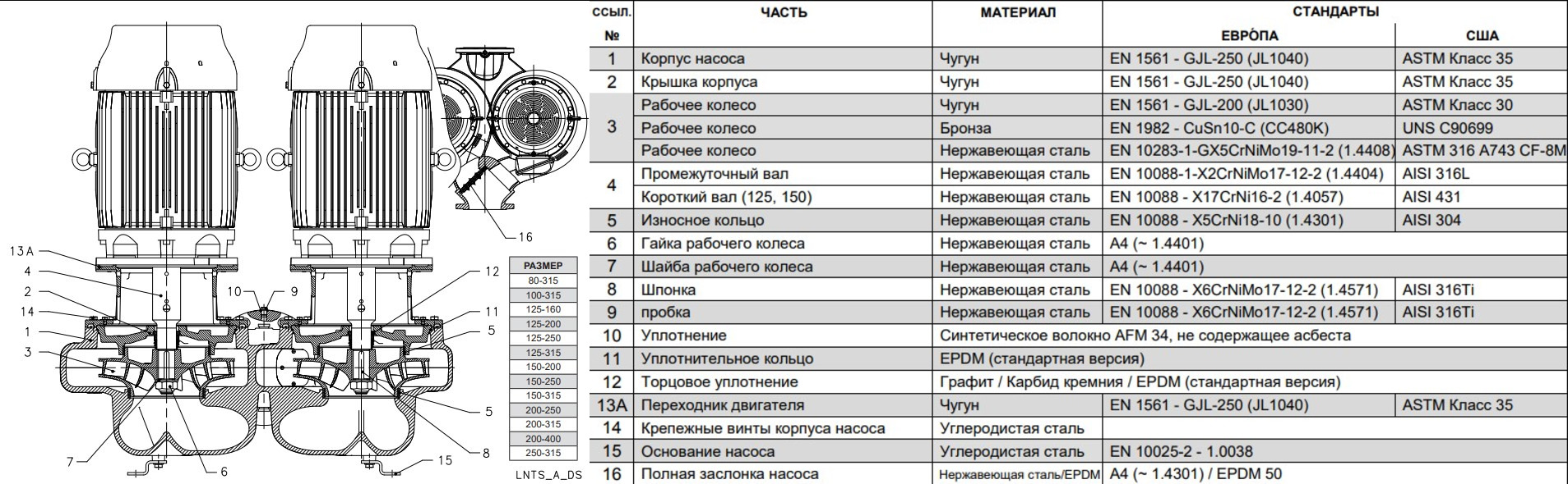 Насос Lowara серии LNTS 125-315/150/P45VCC4 представляет собой сдвоенный центробежный насос со всасывающим и напорным патрубками «ин-лайн» типа. Насосы оснащены закрытыми рабочими колесами, связанными автоматически переключающимся клапаном. Оба насоса могут работать по отдельности или параллельно. Насосы серии LNTS имеют «разъемную» конструкцию (рабочее колесо, переходную муфту, и двигатель можно извлечь, не отсоединяя корпус насоса от трубопровода). Сдвоенные насосы обеспечивают резервирование системы: один насос может работать, а второй оставаться резервным/обслуживаться. Прочная конструкция, разный размер подшипниковых опор и съемные компенсационные кольца из нержавеющей стали обеспечивают долгий срок службы. Серия e-LNT также спроектирована для удобства техобслуживания, все точки обслуживания имеют легкий доступ, что позволяет снизить время простоя.