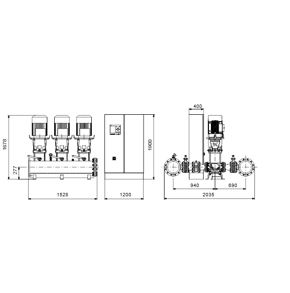 Система повышения давления оборудована насосами CR, подключенными к внешним частотным преобразователям типа CUE Grundfos (по одному для каждого насоса).