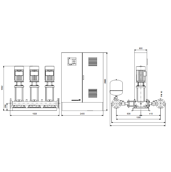 Система повышения давления оборудована насосами CR, подключенными к внешним частотным преобразователям типа CUE Grundfos (по одному для каждого насоса).