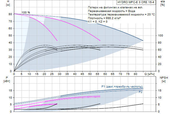 Начиная от 0,37 и до 22 кВт, все станции оснащены насосами CR, CRE, с двигателями со встроенным преобразователем частоты и высокоэффективными постоянными магнитами. Общий КПД этих электродвигателей лучше, чему у двигателей соответствующих стандарту IE4 по IEC60034-31, хотя данный стандарт применяется только для электродвигателей.
