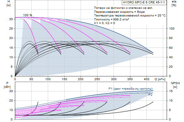 Начиная от 0,37 и до 22 кВт, все станции оснащены насосами CR, CRE, с двигателями со встроенным преобразователем частоты и высокоэффективными постоянными магнитами. Общий КПД этих электродвигателей лучше, чему у двигателей соответствующих стандарту IE4 по IEC60034-31, хотя данный стандарт применяется только для электродвигателей.