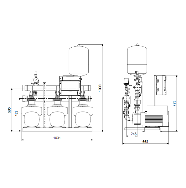 Насосные установки Hydro Multi-E устанавливаются на общую раму-основание, выполненную из нержавеющей стали (DIN W.-Nr. 1.4301). На стороне всасывания устанавливаются приемный коллектор из нержавеющей стали (DIN W.-Nr. 1.4401 или DIN W.-Nr. 1.4571), реле давления на дренажном клапане и запорный клапан. На стороне нагнетания насосов устанавливаются обратный клапан, запорный клапан, манометр, два датчика давления на дренажном клапане, мембранный гидробак и нагнетательный коллектор из нержавеющей стали (DIN W.-Nr. 1.4401 или DIN W.-Nr. 1.4571).