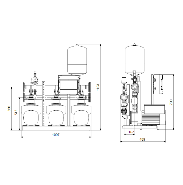 Насосные установки Hydro Multi-E устанавливаются на общую раму-основание, выполненную из нержавеющей стали (DIN W.-Nr. 1.4301). На стороне всасывания устанавливаются приемный коллектор из нержавеющей стали (DIN W.-Nr. 1.4401 или DIN W.-Nr. 1.4571), реле давления на дренажном клапане и запорный клапан. На стороне нагнетания насосов устанавливаются обратный клапан, запорный клапан, манометр, два датчика давления на дренажном клапане, мембранный гидробак и нагнетательный коллектор из нержавеющей стали (DIN W.-Nr. 1.4401 или DIN W.-Nr. 1.4571).