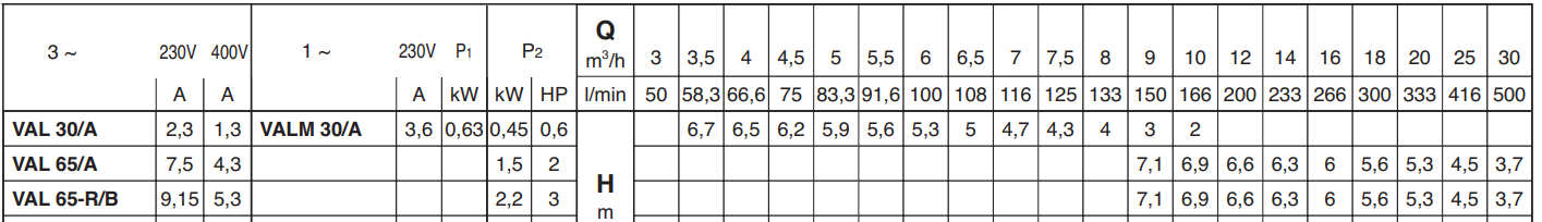 Calpeda VAL — вертикальные электронасосы колонного типа с наружным двигателем и корпусом, погружаемым в перекачиваемую жидкость. Применение: для слегка загрязненных жидкостей, для жидкостей, не содержащих абразивных частиц и не агрессивных к конструкционным материалам насоса; для слива воды из ванн или дренажа канав с бытовыми и промышленными стоками.