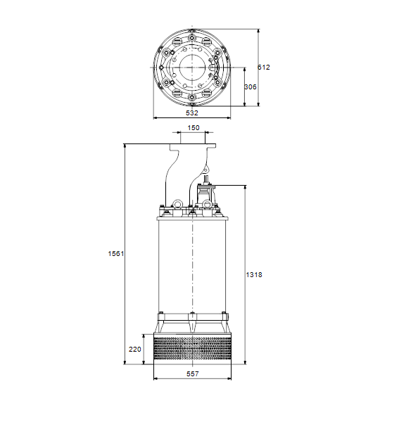 Насос выполнен из чугуна, имеет вертикальный напорный канал и оснащен встроенным погружным трехфазным закрытым электродвигателем, имеющим класс изоляции F (155°C).