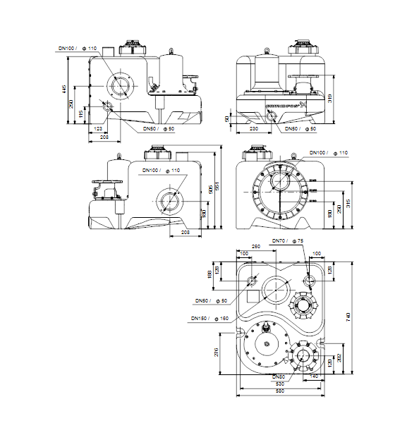 Резервуар содержит 7 входных патрубков по периметру. На задней стороне входной патрубок DN100 с запатентованным дисковым входом для бесступенчатого подключения всех трубопроводов (в центре) от 180 до 315 мм. Патрубки DN100 и DN50 на каждой стороне. DN150, DN50 на верхней части резервуара.