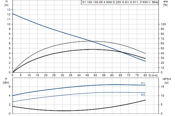 Насос предназначен для периодической и непрерывной эксплуатации в погруженном положении. Одноканальное рабочее колесо пропускает твердые частицы размером до 100 мм .