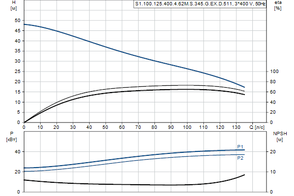 S1.100.125.400.4.62M.S.345.G.EX.D.511Несамовсасывающий одноступенчатый центробежный насос, предназначенный для перекачивания сточных вод, технологических вод и неочищенных сточных вод, не пропущенных через решетку. Насос предназначен для периодической и непрерывной эксплуатации в погруженном положении. Одноканальное рабочее колесо пропускает твердые частицы размером до 100 мм . Система регулирования зазора рабочего колеса SmartTrim позволяет обеспечивать максимальную производительность в течение срока службы насоса. Для облегчения транспортировки, а также монтажа на месте насос оснащен прочным подъемным кронштейном. При монтаже на автоматической трубной муфте система уплотнения Grundfos SmartSeal обеспечивает герметичное соединение. Соединения трубопроводов обеспечиваются с использованием фланца DIN . Насос имеет взрывобезопасное исполнение.
