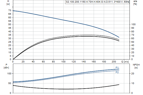 Насос предназначен для периодической и непрерывной эксплуатации. Охлаждающий кожух обеспечивает возможность работы насоса, установленного в погруженном или «сухом» положении, без охлаждения электродвигателя. Двухканальное рабочее колесо пропускает твердые частицы размером до 100 мм .