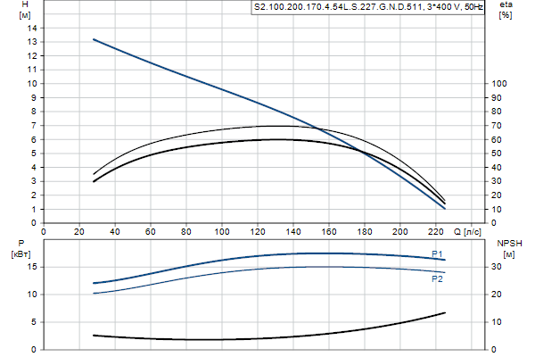 Насос предназначен для периодической и непрерывной эксплуатации в погруженном положении. Двухканальное рабочее колесо пропускает твердые частицы размером до 100 мм .