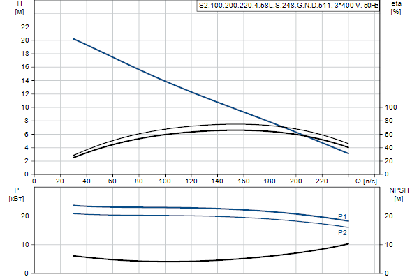 Насос предназначен для периодической и непрерывной эксплуатации в погруженном положении. Двухканальное рабочее колесо пропускает твердые частицы размером до 100 мм .