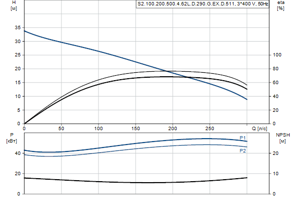 Насос предназначен для периодической и непрерывной эксплуатации. Охлаждающий кожух обеспечивает возможность работы насоса, установленного в погруженном или «сухом» положении, без охлаждения электродвигателя. Двухканальное рабочее колесо пропускает твердые частицы размером до 100 мм .