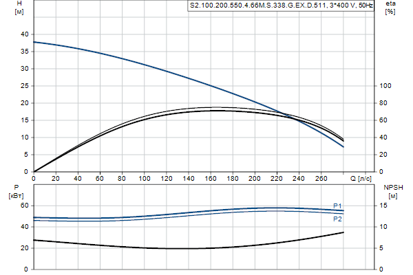 Насос предназначен для периодической и непрерывной эксплуатации в погруженном положении. Двухканальное рабочее колесо пропускает твердые частицы размером до 100 мм .
