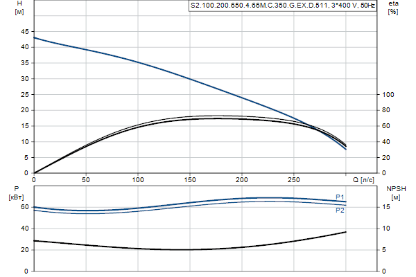 Насос предназначен для периодической и непрерывной эксплуатации. Охлаждающий кожух обеспечивает возможность работы насоса, установленного в погруженном или «сухом» положении, без охлаждения электродвигателя. Двухканальное рабочее колесо пропускает твердые частицы размером до 100 мм .