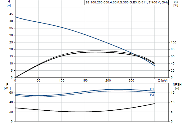 Насос предназначен для периодической и непрерывной эксплуатации в погруженном положении. Двухканальное рабочее колесо пропускает твердые частицы размером до 100 мм .