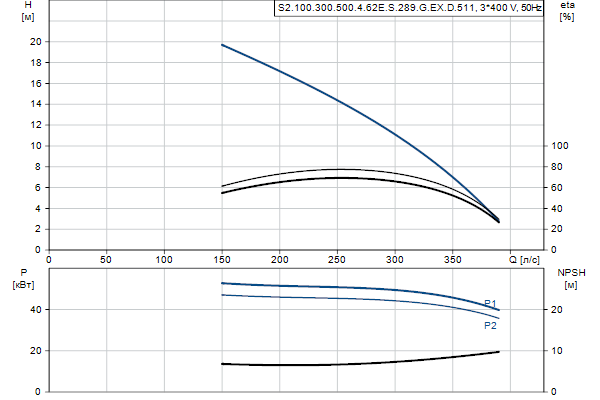 Насос предназначен для периодической и непрерывной эксплуатации в погруженном положении. Двухканальное рабочее колесо пропускает твердые частицы размером до 100 мм .