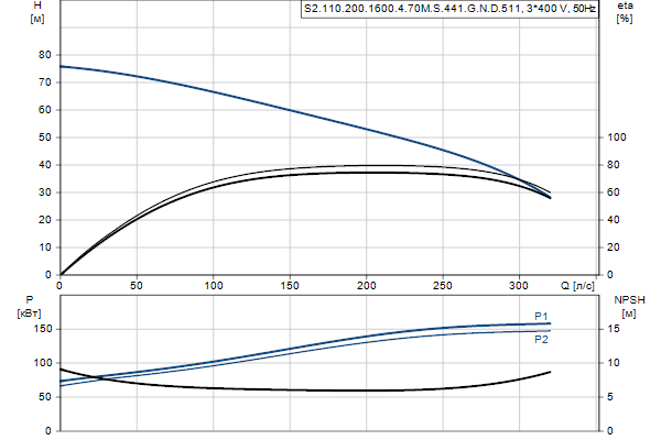 Насос предназначен для периодической и непрерывной эксплуатации в погруженном положении. Двухканальное рабочее колесо пропускает твердые частицы размером до 110 мм .