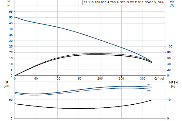 Насос предназначен для периодической и непрерывной эксплуатации. Охлаждающий кожух обеспечивает возможность работы насоса, установленного в погруженном или «сухом» положении, без охлаждения электродвигателя. Двухканальное рабочее колесо пропускает твердые частицы размером до 110 мм .