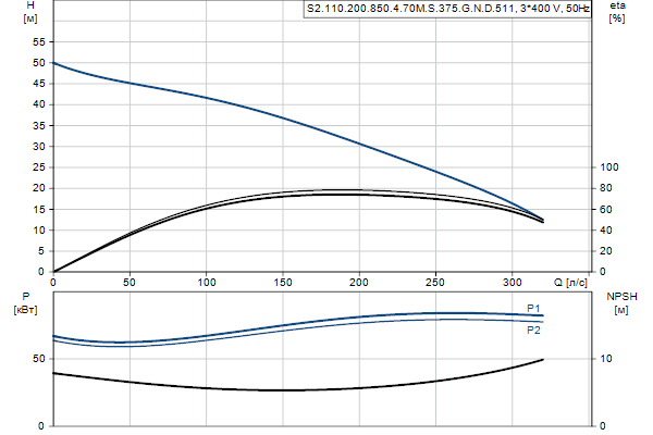 Насос предназначен для периодической и непрерывной эксплуатации в погруженном положении. Двухканальное рабочее колесо пропускает твердые частицы размером до 110 мм .