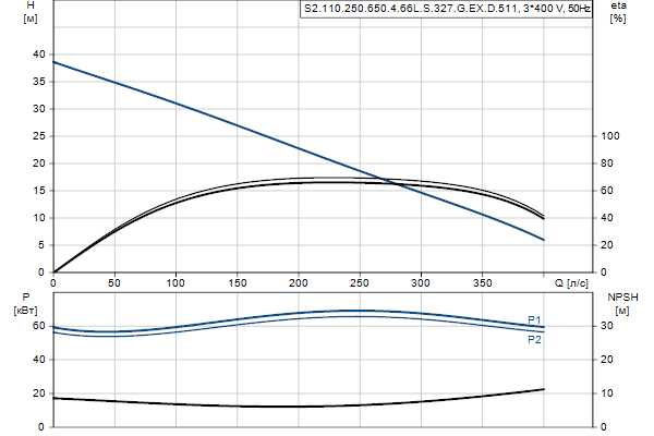 Насос предназначен для периодической и непрерывной эксплуатации в погруженном положении. Двухканальное рабочее колесо пропускает твердые частицы размером до 110 мм .